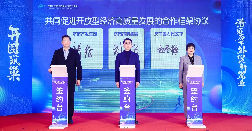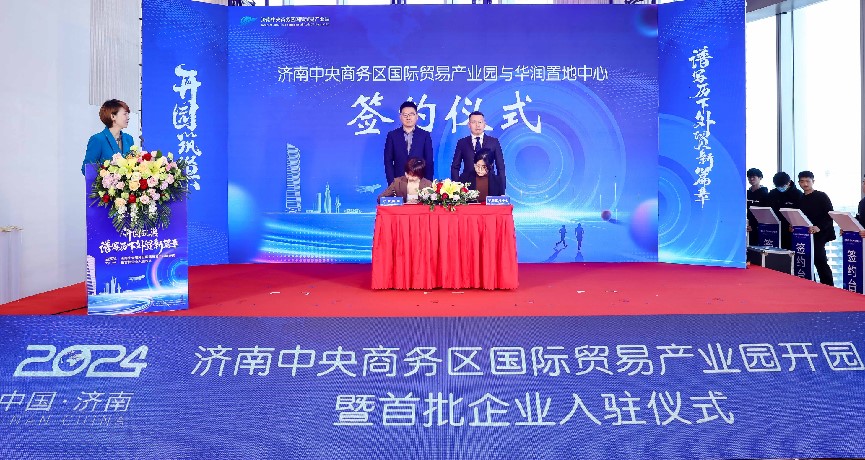 在入駐簽約環(huán)節(jié),濟南國商園區(qū)運營管理有限公司總經(jīng)理陳蕾與華潤置地中心項目負責人李靜宜簽訂了委托運營協(xié)議;劉燕飛、趙冬梅、褚征分別代表濟南市商務局、濟南市歷下區(qū)人民政府、濟南產(chǎn)發(fā)集團共同簽署《共同促進開放型經(jīng)濟高質量發(fā)展合作框架協(xié)議書》;王紅、楊傳軍、趙治文、楊福濤、王海清、黃蓓、邵丹丹共同按下啟動開園按鈕,宣告濟南中央商務區(qū)國際貿易產(chǎn)業(yè)園正式開園。